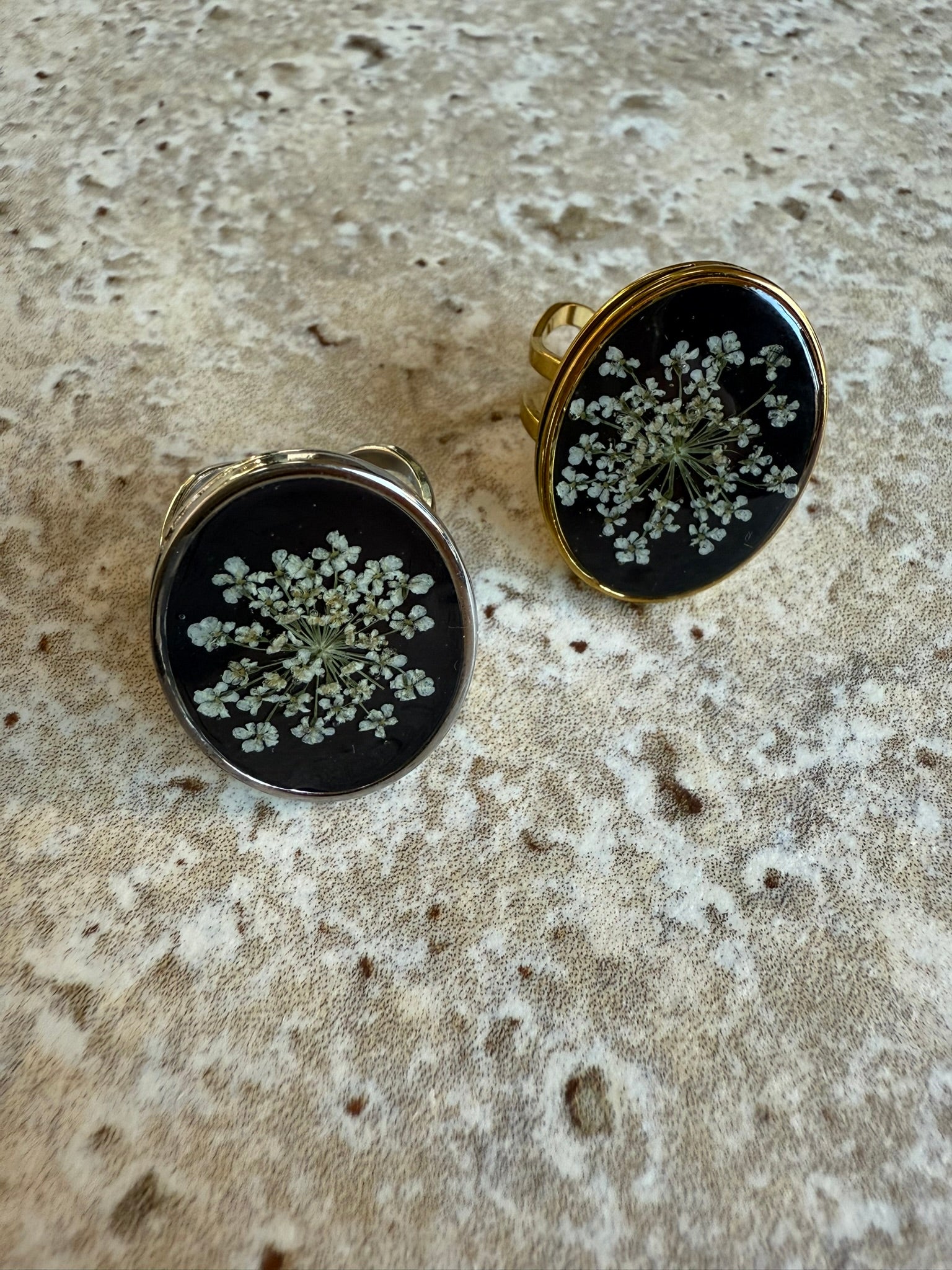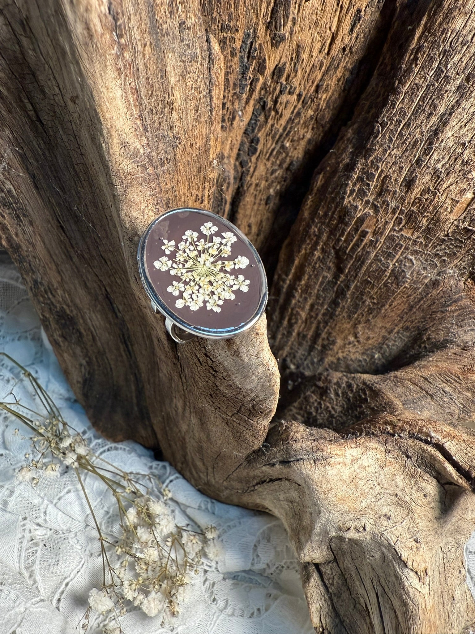 Ce bijou renferme une fleur de carotte sauvage, symbole de protection, de liberté et de beauté discrète.