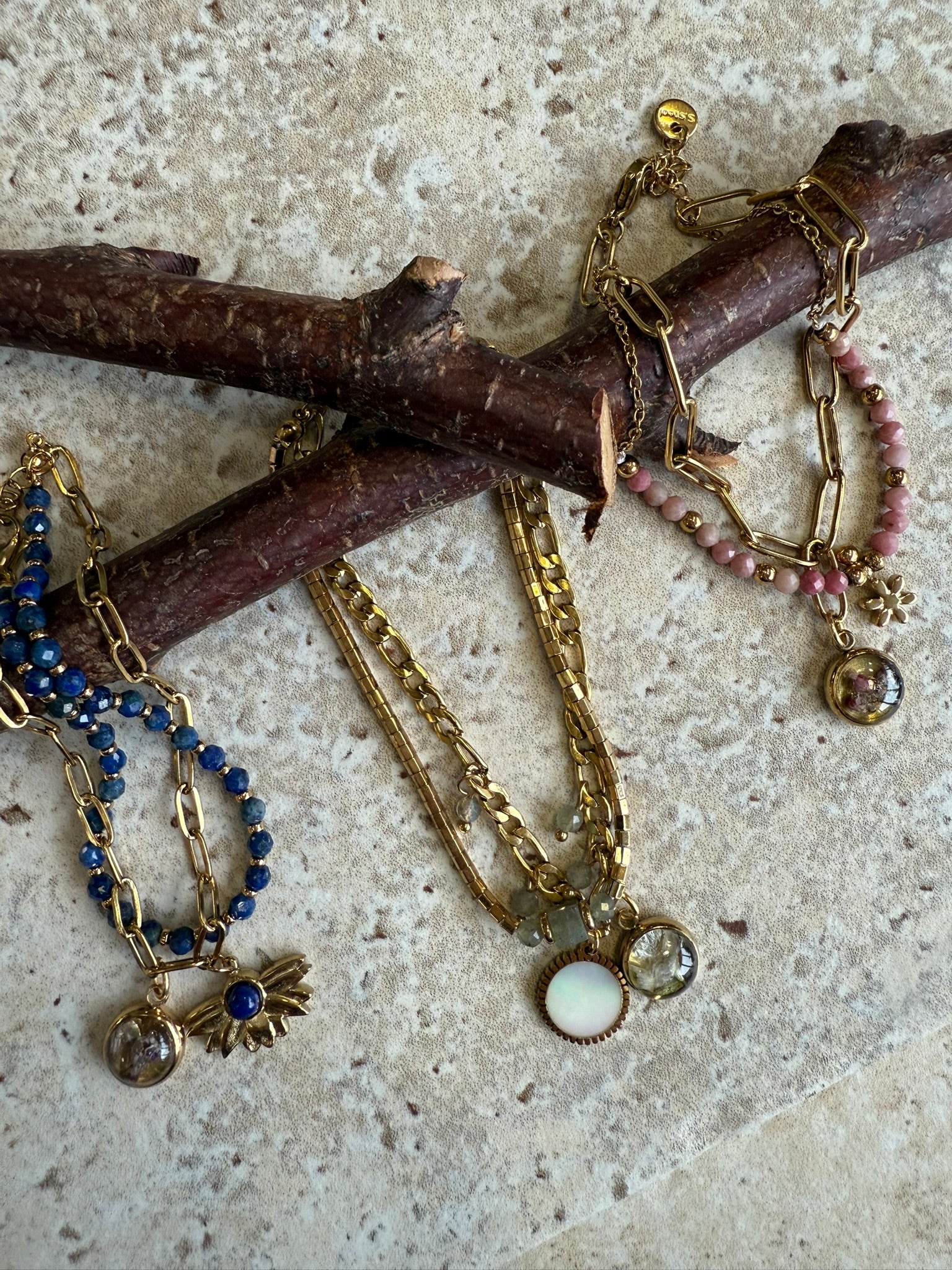 Fabriqué à la main dans nos atelier, chaque modèle est unique. Bracelet en acier inoxydable plaqué or 18 carats, Berthe allie délicatesse et caractère, avec ses breloques uniques qui racontent une histoire à fleur de peau.