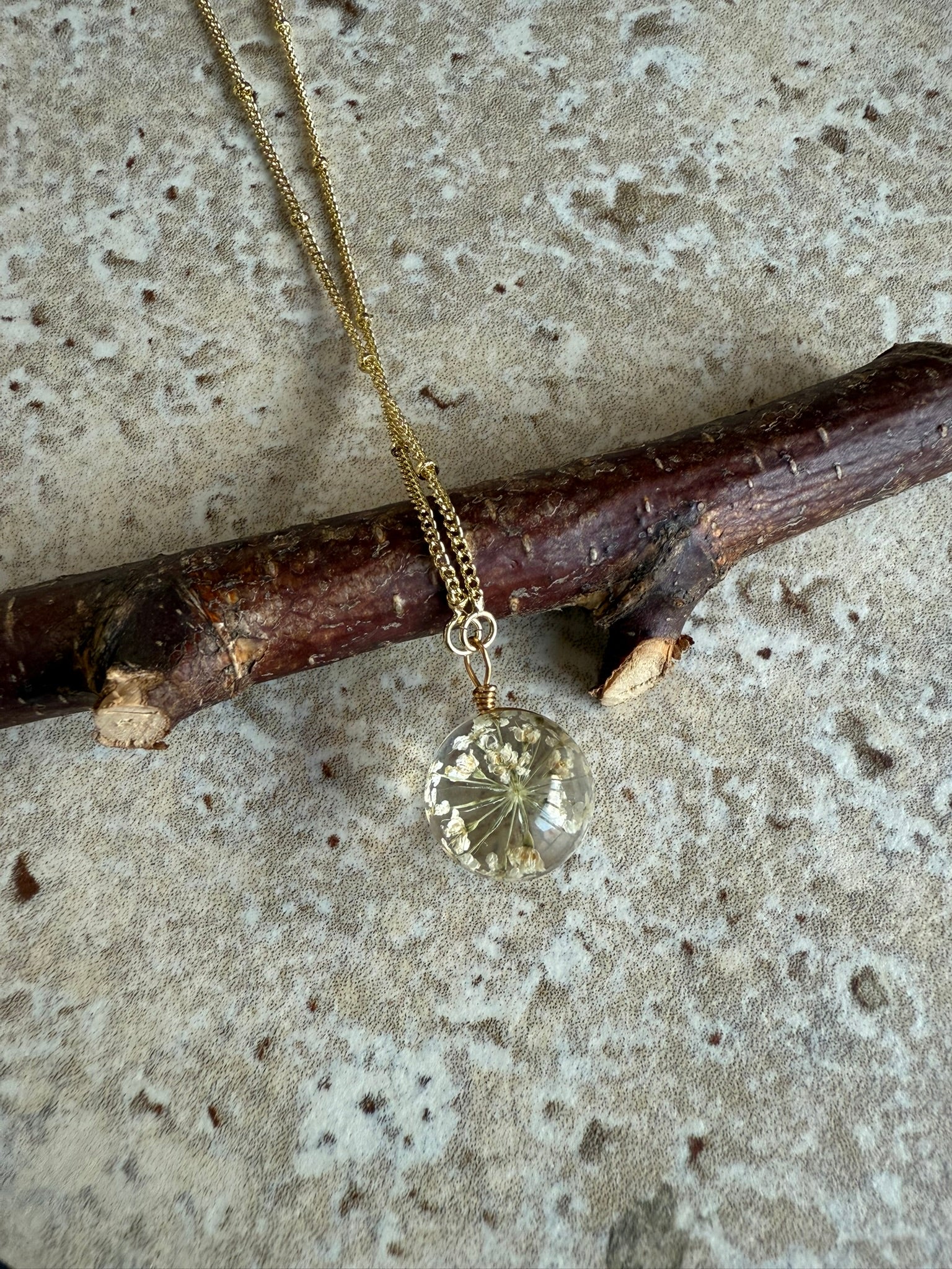 Ce bijou renferme une fleur de carotte sauvage, symbole de protection, de liberté et de beauté discrète.