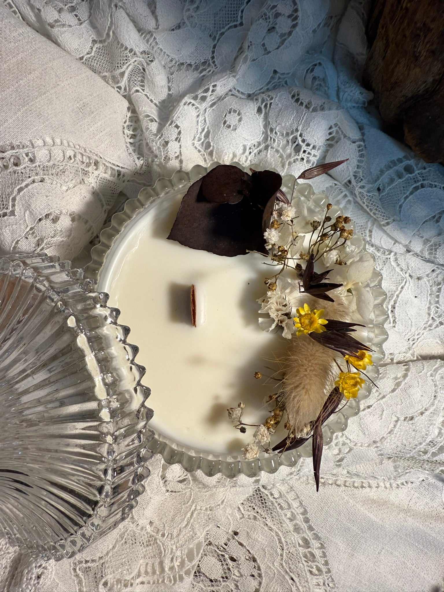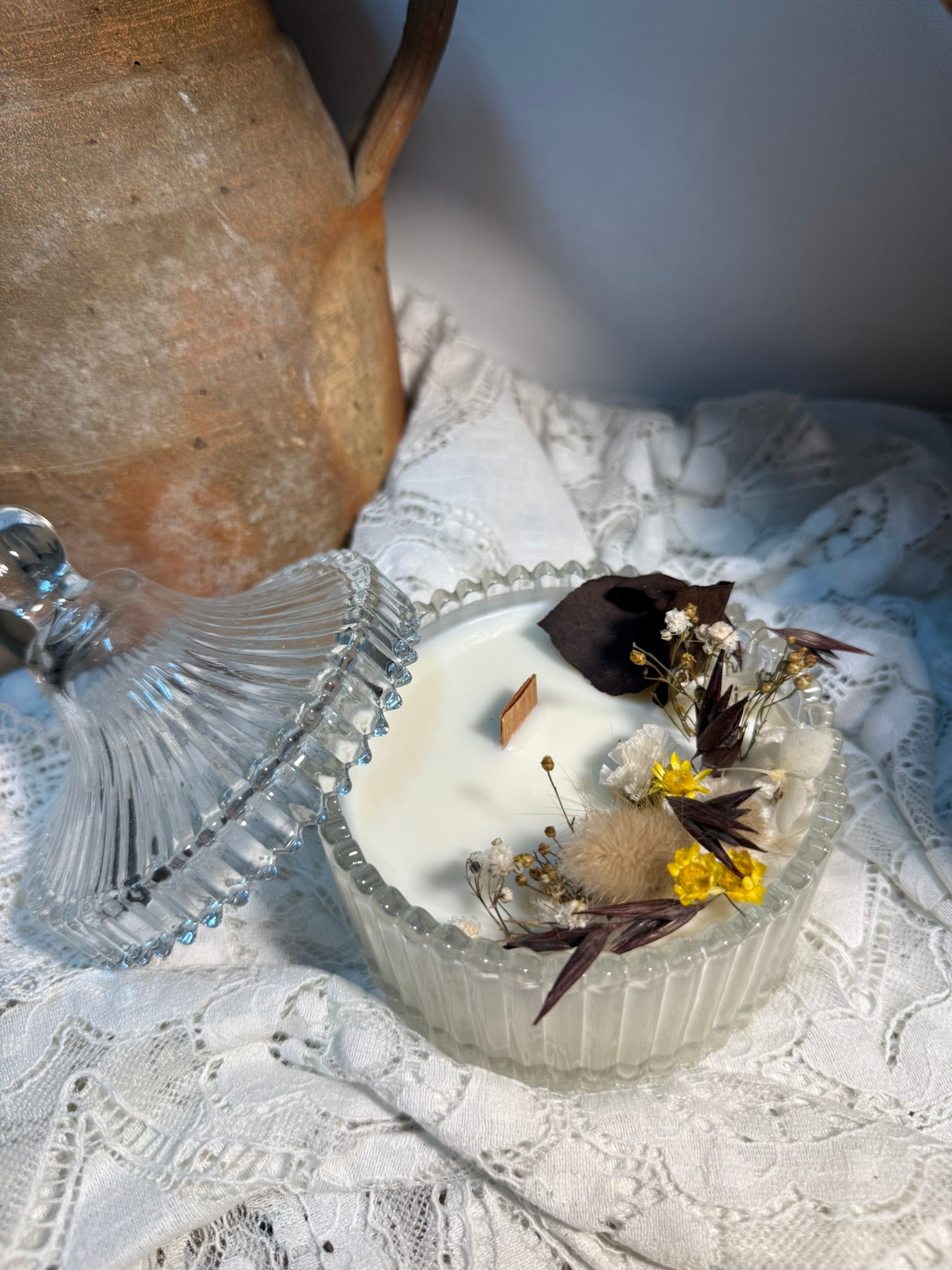 Son décor, orné à la main de fleurs séchées aux teintes dorées, évoque le sable chaud et les instants suspendus. Présentée dans un raffiné contenant en verre, cette bougie invite au voyage et à la détente, comme une caresse de soleil sur la peau.